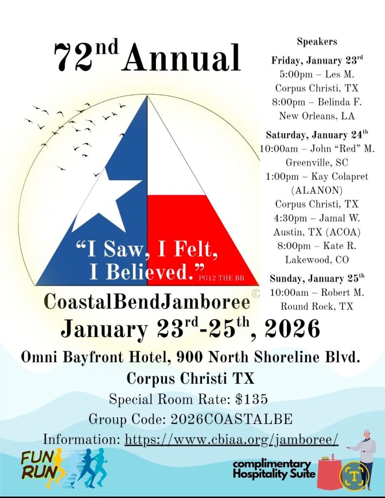 Coastal Bend Intergroup’s biggest fundraiser of the year is starting a week from today, January 23rd.. This conference is how we help keep the door open and the phones on!